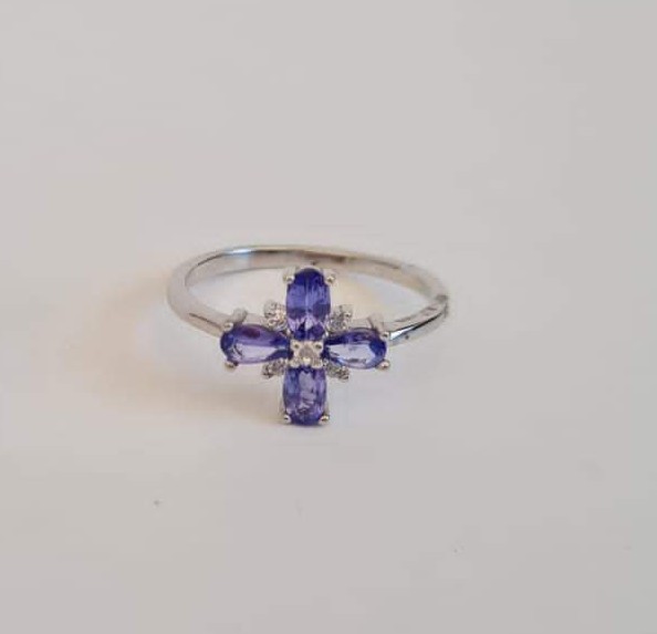 Este é um anel delicado e elegante, caracterizado pelo seu design floral e pela beleza da gema tanzanita.